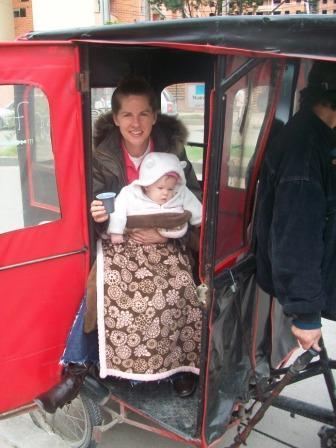 ~Since the bakery we were going to go to was about 1/2 mile away, I asked Phillip if we could ride in one of these fun bicycles. He agreed. He was across the street buying a hot herbal drink to help a lady out, so I flagged this bicyclist down for us.~