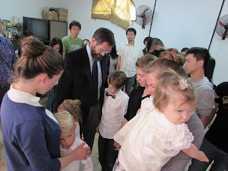 ~Aunt Caro praying for our family. (Phillip was chasing a run-away-Abigail. :-) ~